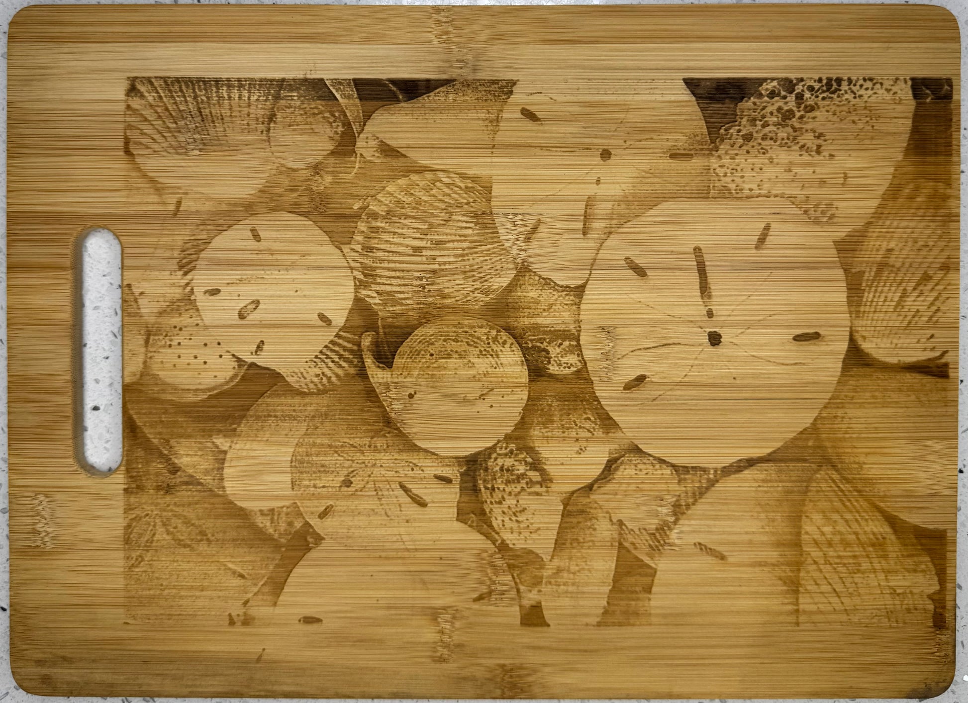 Beautiful ocean theme cutting board with all the sand dollars the sand dollar will make a beautiful addition to your kitchen. This cutting board is 15x11 3/8 inch thick bamboo.